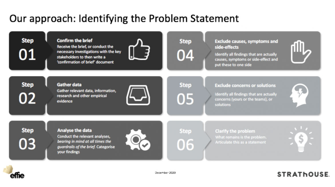 In these situations, as a Strategy practice (rather than agency), we triage the problem using the Problem Statement approach to map and categorise all of the causes, symptoms, side-effects, (potential) solutions – in order to then isolate the thing we need to focus our time and energy on …the problem. It’s a good way of making sure we: